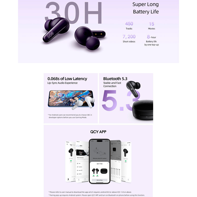 هر گوشی ایرپاد qcy مدل bh23qt26a در ساختار داخلی خود به درایوری 7.2 میلی متری مجهز شده تا صدا را به خوبی به گوشتان برساند. البته این درایورها با توجه به قیمت معقول هندزفری بلوتوثی QCY T13X، از پس پخش موسیقی های بیس دار برنمی آیند و ممکن است برخی از آهنگ ها در آنها با وضوح فوق العاده پخش نشوند اما در حد معمولی قابل قبول هستند. اما این تمام ماجرا نیست چرا که برای ایجاد تجربه شنیداری بهتر 3 پروفایل اکولایزر پیش فرض توسط برترین استادان موسیقی برای این مدل تنظیم شده تا موسیقی را به سبک خود بشنوید. برای دسترسی به پروفایل های اکولایزر و انجام سایر تنظیمات لازم است که اپلیکیشن qcy t13x را بر روی گوشی خود نصب نمایید که با سیستم عامل اندروید 8 به بالا و iOS 13 به بالا سازگار است.